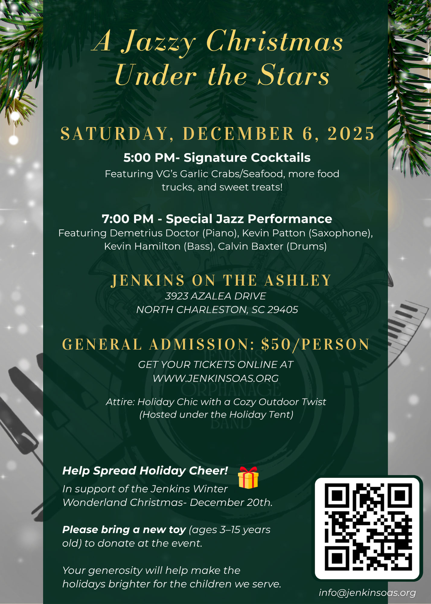 Enjoy a cozy outdoor evening under the holiday tent! Savor signature cocktails and food trucks including local seafood, along with the captivating sounds of live jazz featuring Demetrius Doctor (Piano), Kevin Patton (Saxophone), Kevin Hamilton (Bass), and Calvin Baxter (Drums).